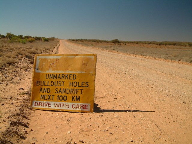 A warning on the Plenty Highway. Yes! This is a highway, not at all like people imagine a highway to be.