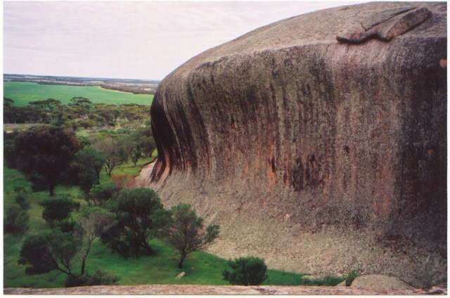 Pildappa Rock is one of the many inselbergs in Australia (Uluru is also one). An inselberg or monadock is an isolated hill, knob or rock rising out of a flat plain. Geologists believe the formation is a result of water seepage into the soil at the base of the rock and over time the permanently moist soil conditions softened the rock and then the effects of wind and rain caused the flare or wave form we see today. The softening took place when the surrounding plain was higher than it is today.