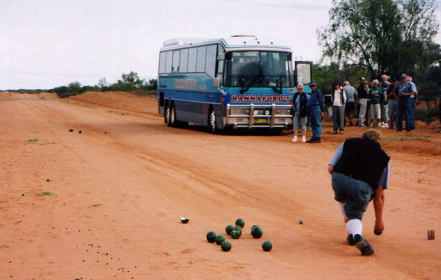 A morning tea game of paddymelon bowls along the Wanaaring Road, NSW