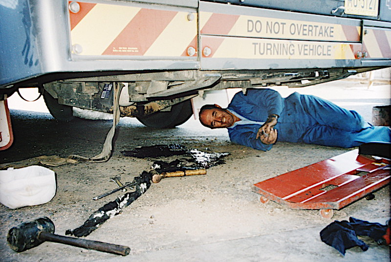 Our driver Tappie in his element fixing a leaky sump so we wouldn’t be late for dinner. Liquid steel did the trick.