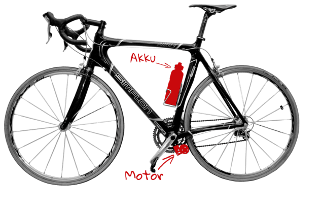 The Add-e motor is friction drive onto the rear wheel. The battery (akku) slips into the water bottle holder. Image credit: I borrowed this image from http://www.add-e.at/onlineshop web page.