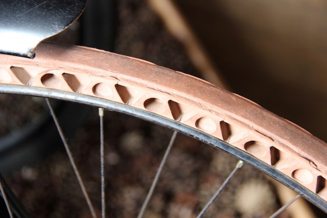 An older version of the Tannus. Note the metal staple holding the tyre joint together. On display in the Velo Museum.