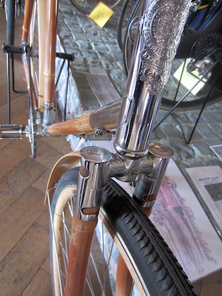 Front forks and frame of a bamboo bike. Velo Museum.
