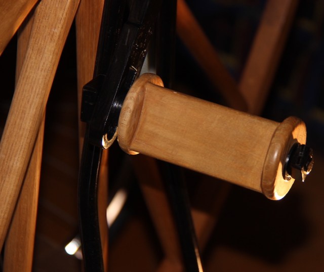 Wooden pedal on an ecologically friendly wooden bike. Velo Museum.