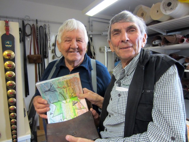 Marcello making a gift to me of a 1941 leather Swiss Army map case in which my concertina book fitted perfectly.