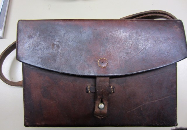 The 1941 Swiss Army map case. Cases such as this one hung on the side of the Swiss army bicycle. Observe the perfect circle of stitching, not done by machine but by hand!