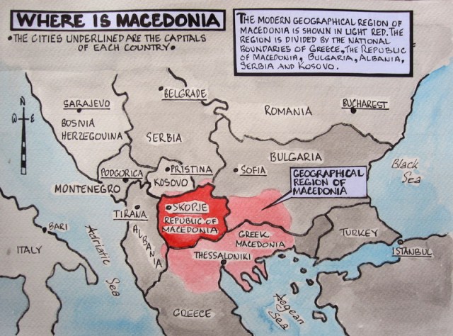 On the above map the lighter red is the geographical region of Macedonia and the deeper red is the Republic of Macedonia. Depending on your political persuasions if you say you are going to Macedonia you could in fact be going to Thessaloniki. Political correctness suggests that if you are going to Skopje you should say I’m going to the Former Yugoslavian Republic of Macedonia (FYROM).