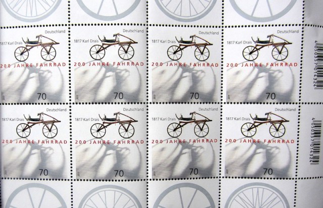 This year, 2017, marks the 200th anniversary of the invention of the bicycle. There is debate as to by whom and when the bicycle was invented, however it is generally agreed it was invented by German, Baron Karl Drais in 1817. German Deutsche Bundespost believe this to be true as they recently published a stamp to commemorate the event.