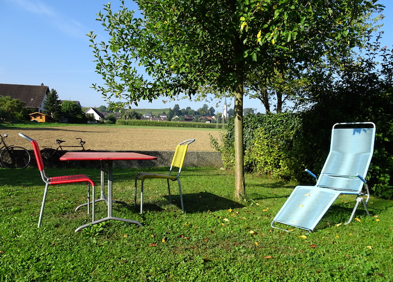 The garden that awaited us on our arrival in Zurich. The sun and the recliner chair provided a warm rest after the long flight. The garden furniture is produced by a prisoner enterprise in Zurich.
