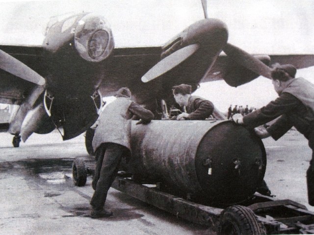 A ‘blockbuster’ bomb similar to the type found in Augsburg and defused on Christmas day 2016. The aeroplane shown is not a Lancaster but a Mosquito. Image credit: from the late J E Saunderson collection.