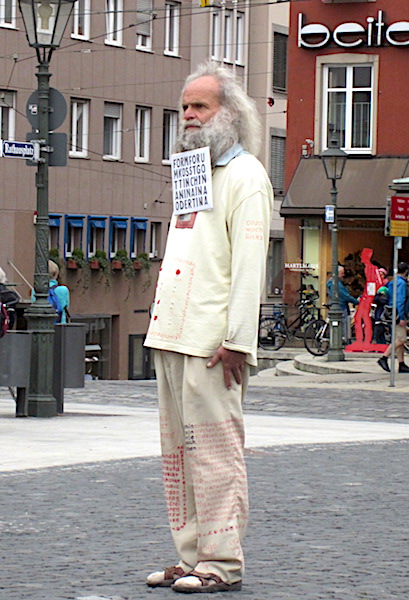 Augsburg eccentric known as the King of Augsburg. He stands stock still, turning occasionally through 90 degrees. The sign says nothing comprehensible.