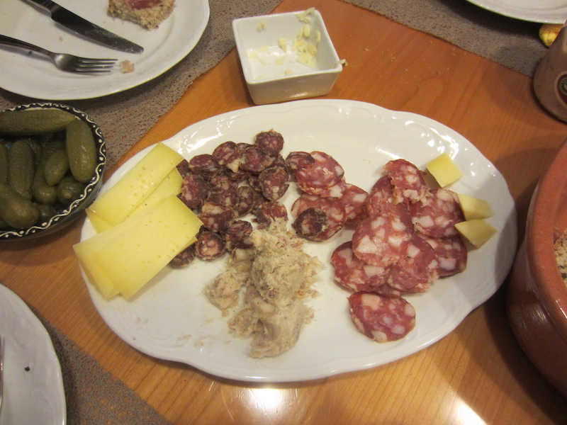 Pickled gherkins, salami and pig fat (front edge of the plate) used as a spread on bread.