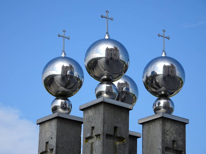 Spheres on the top of an exterior staircase newell post. The church can be seen in the reflection.