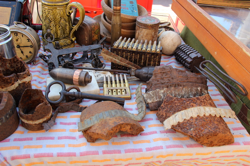 All manner of things. Hand grenade (right), shrapnel, bullet clips, a huge key and the lovely old alarm clock.