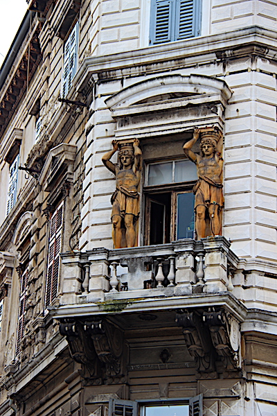 A couple of handsome telamons supporting an entablature. The female version of the telamon is a caryatid.