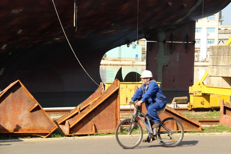 Propulsion end. The shipyard is so extensive the workers need a bicycle to travel around it.
