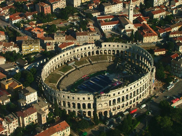 The Roman amphitheatre in Pula. It should be noted that Roman arenas are not circular but elliptical/oval. Image credit: Wikipedia.