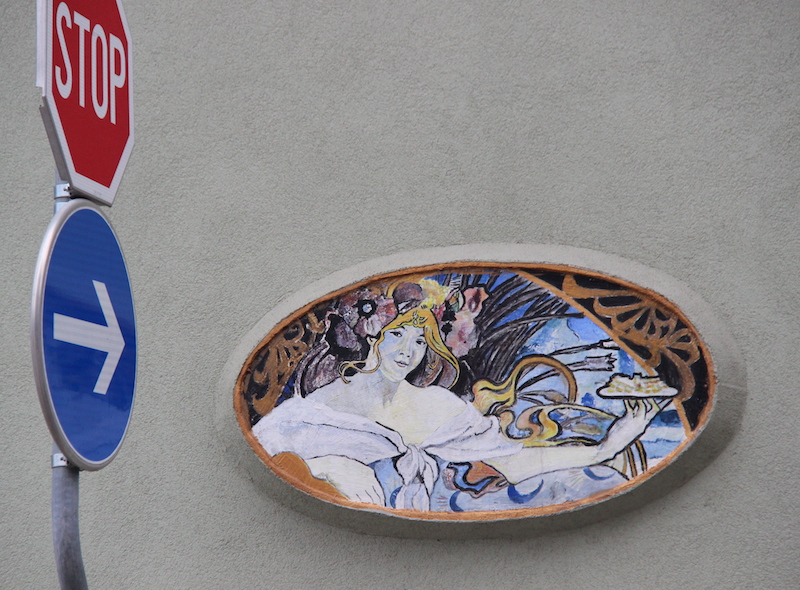 A copy of artist Alfons Mucha’s painting of the French actress Sarah Bernhardt on the side of Pula Art Host. Alfons Mucha’s work was popular in the 1930s.