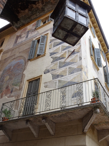 A balcony, door, window, lamp and an artistic wall thrown in.