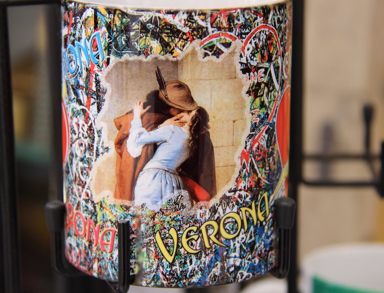 Romeo smooching Juliet on a mug in a rack outside one of the many souvenir shops.