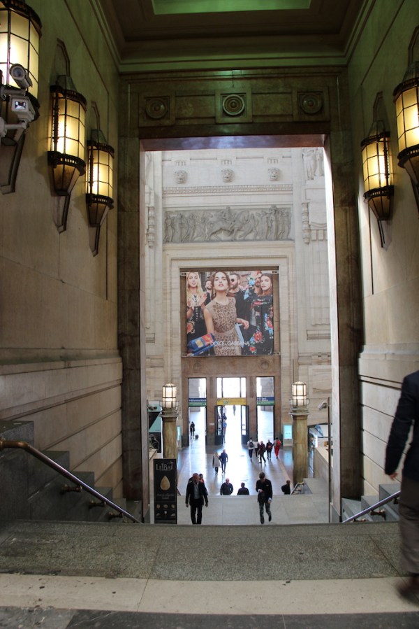 Passengers exiting from the station with an intrusive advertisement overhead.