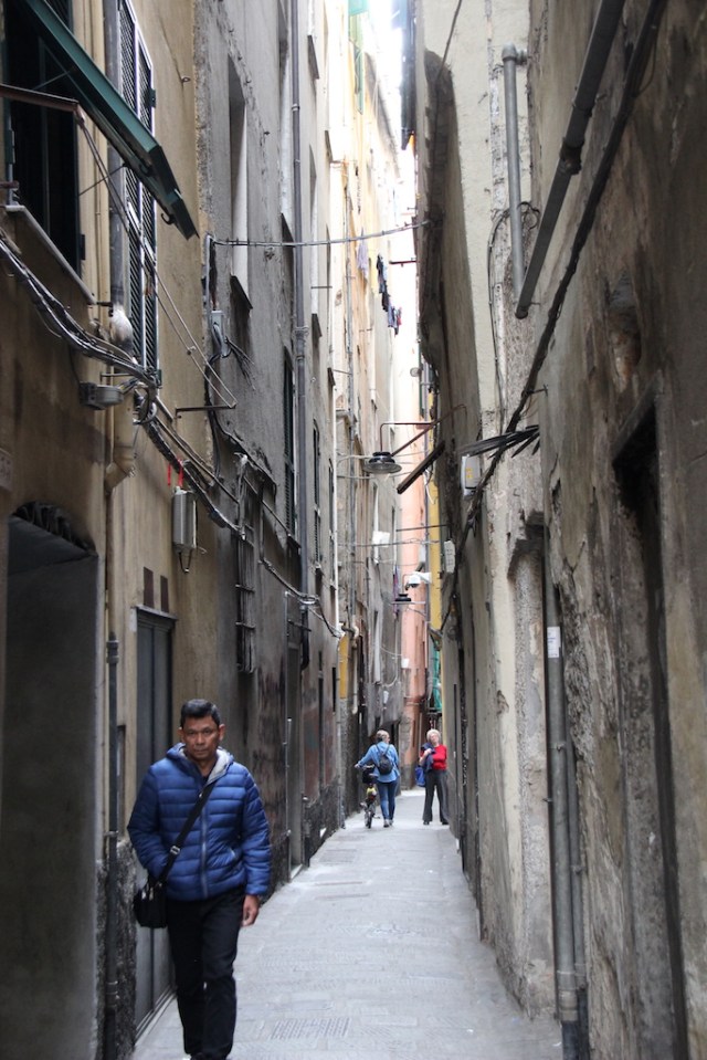 Most cities in Europe have an old quarter and the old quarter of Genova is a gem. The gem is in the Caruggi district where alleyways as narrow as a saw cut pass at angles every which way creating enticing and quirky alleys waiting to be explored. Bev and I sat in an open-air café within the old quarter and watched the workings of this ancient location. If you closed your eyes, listened and breathed the air the sounds and smells would be the same as to those of centuries before.