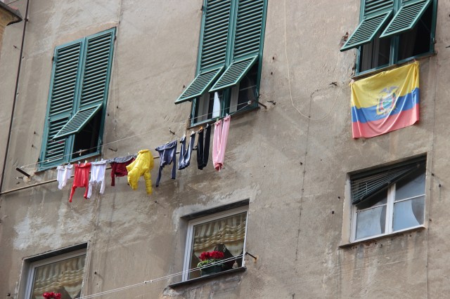 The washing, the flag of Ecuador and an ill-adjusted blind, a few of the many signatures of the Caruggi district .
