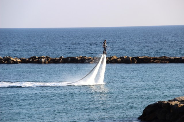 A high-pressure pump in the personal watercraft was connected by a pipeline providing the high-pressure water blast that kept the rider airborne. It would take a lot of skill to remain upright and a fall from on high could be disastrous.