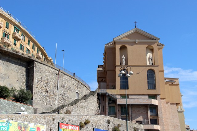 There is a wide promenade, a pedestrian/cycle path, running some kilometres along the waterfront and to one side is the Ligurian Sea and on the other a cliff face from which houses and churches hang precariously. The houses along the boulevard are the homes of the wealthy. I will take you there first then into the back streets where the not so affluent live.