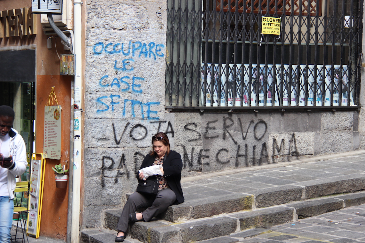 Lunch stop. The blue graffiti translates as ‘occupy the houses’.
