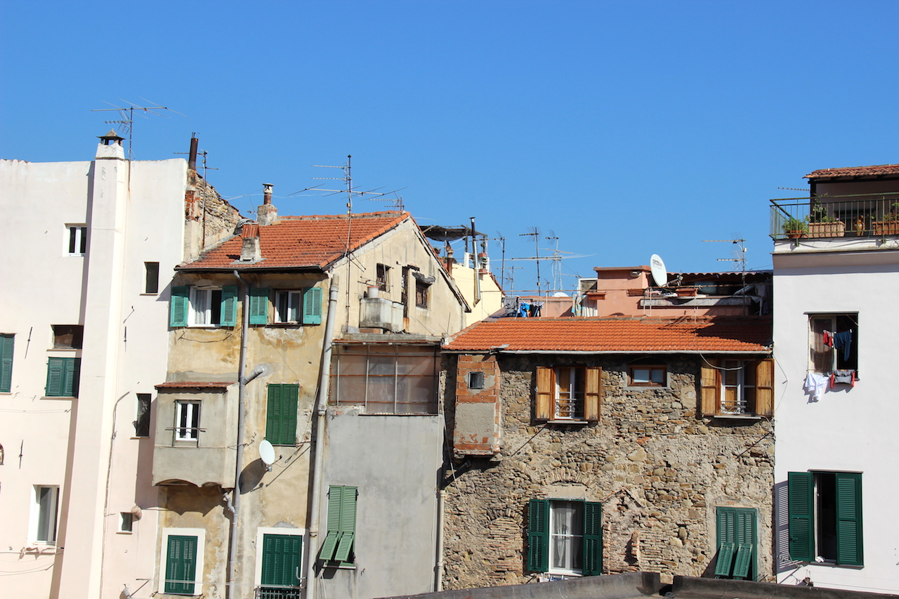 The view from our hotel window. Hundreds of years of building evolution, stone and stuccoed walls, shutters and windows, twisted downpipes and chimneys, all work and toil.