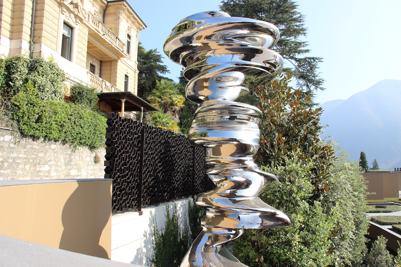 Money to burn: steel fence and stainless steel sculpture at the front entrance to one of the lake houses.