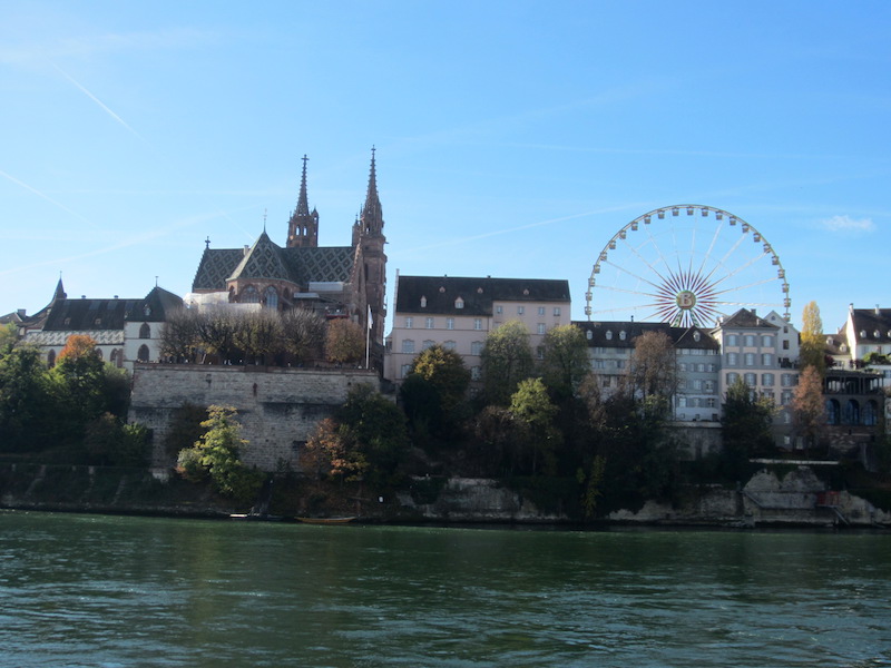 The Basel Minster (standing in Switzerland), Ferris wheel and the River Rhine.
