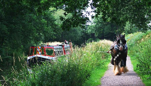 Modern day horse drawn pleasure barge. The towing rope is attached to the centre of the roof of the barge. Image credit: From a tourist brochure, UK.