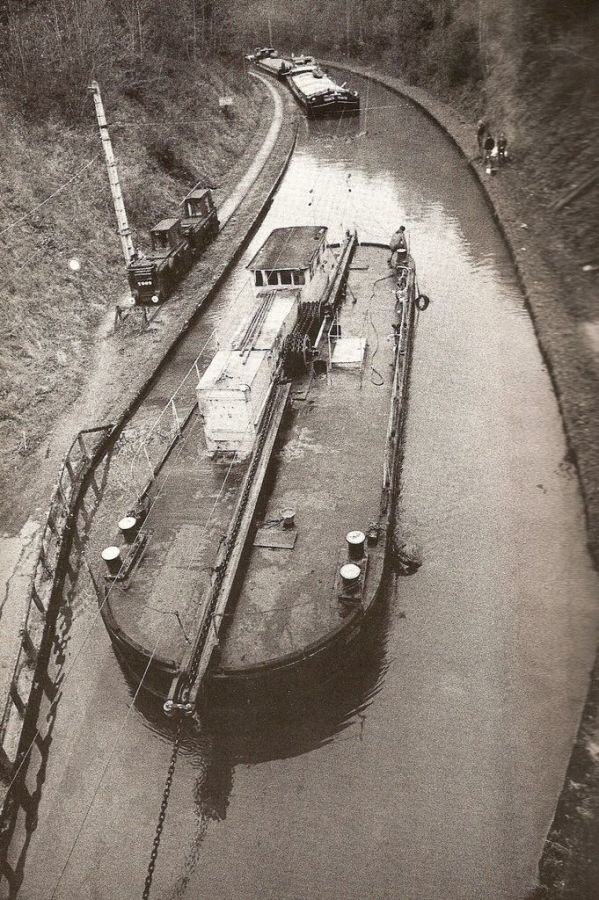 A barge pulling itself along a chain which was laid on the bottom of the canal.
