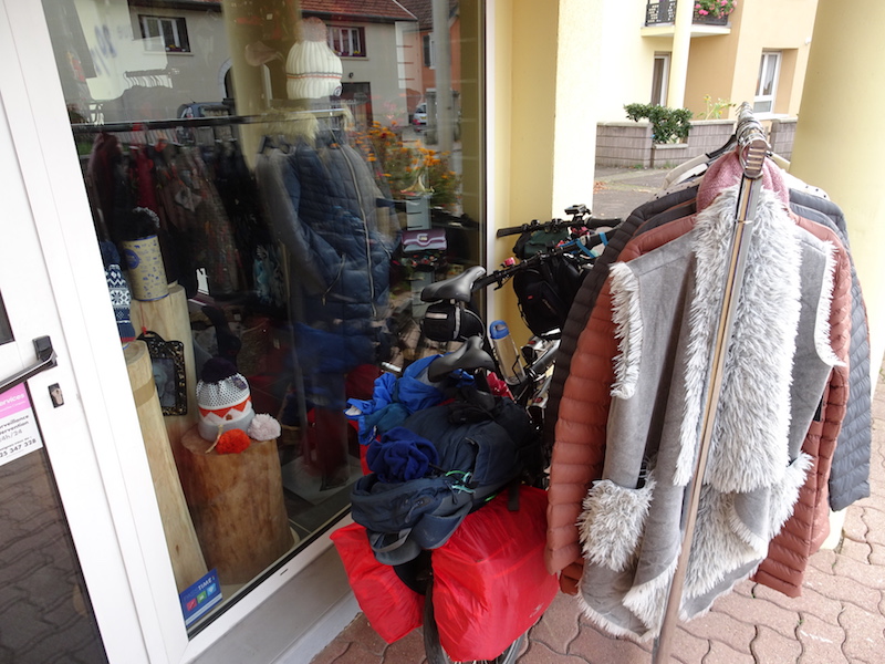 Our bikes hidden behind the clothes rack.