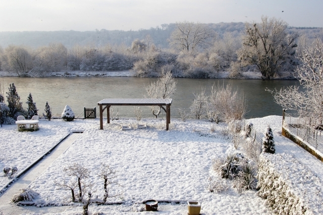 A winter view from the cosy Aux berges du Doubs. Snow is not wet like rain and had it snowed like in the view from our bedroom window we would have rejoiced. Image credit: from Aux berges du Doubs website…http://www.chambre-hote-auxbergesdudoubs.com/