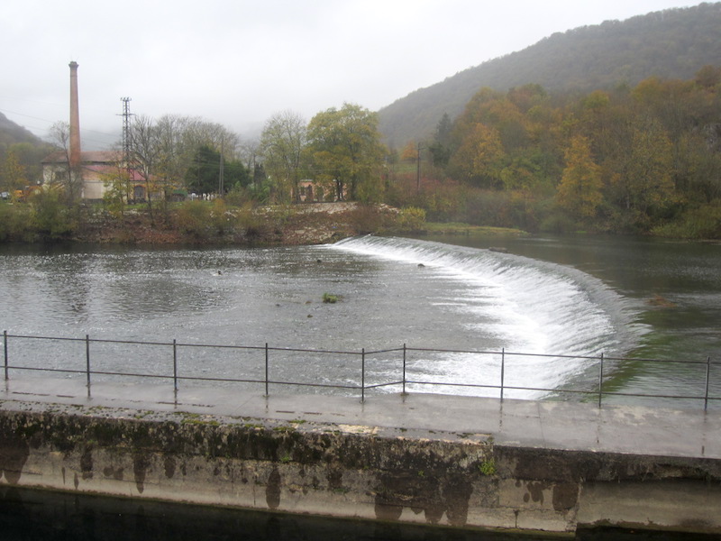 Weir across the Doubs River providing water for a hydro electricity plant. A lock is in the foreground.