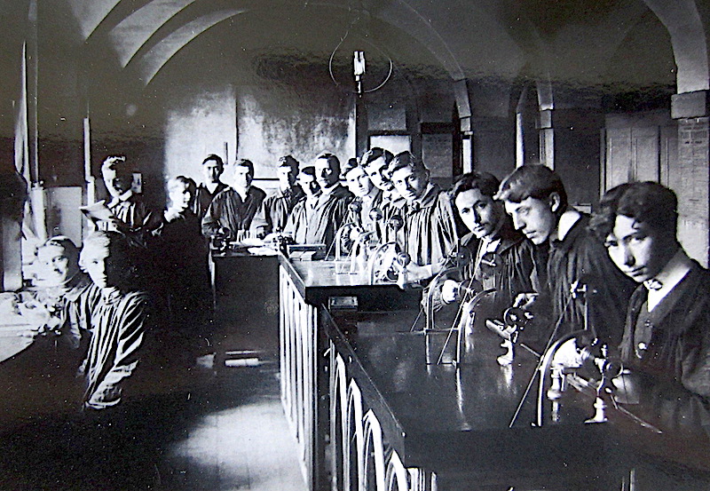 Well-dressed lads in 1908-1909 making watch parts on small pedal lathes. Image credit: Musee du Temps, Besançon. Service promotion and enterprise.
