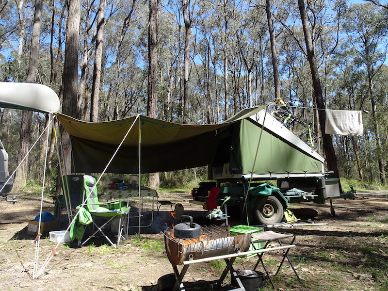 Our pop-top camper trailer and annexe set up. The foldup bikes stand on top of the camper roof.