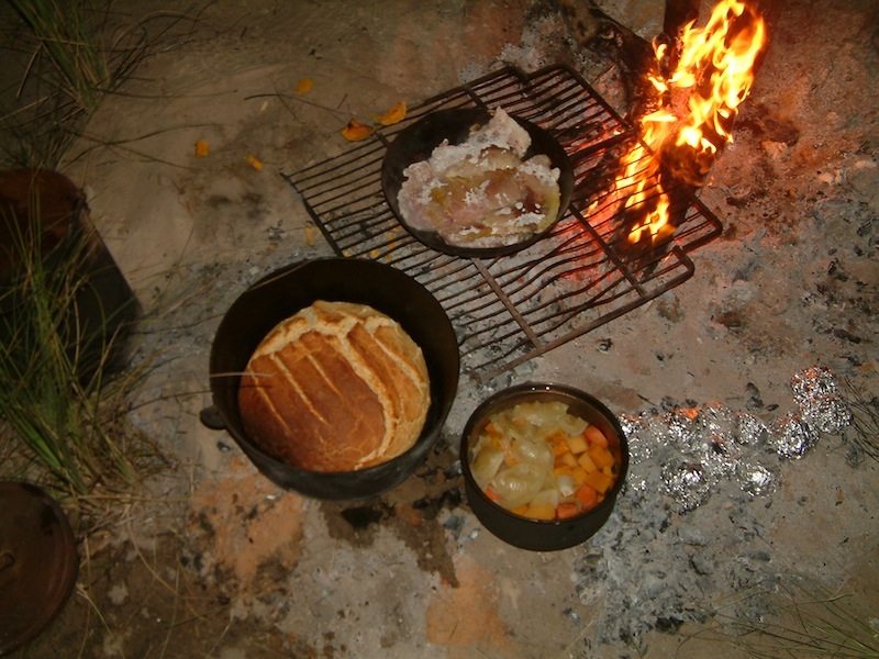 Camp oven (left) with freshly baked bread and a feed of fish, vegetables and potatoes (wrapped in aluminium foil and buried in ashes).