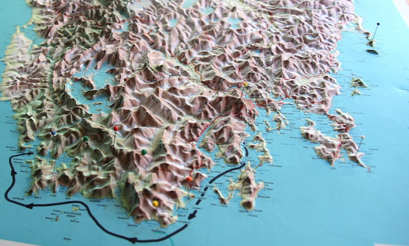 Southwest Tasmania. This relief map shows how mountainous Tasmania is and our route from Kettering near Hobart to the southwest.