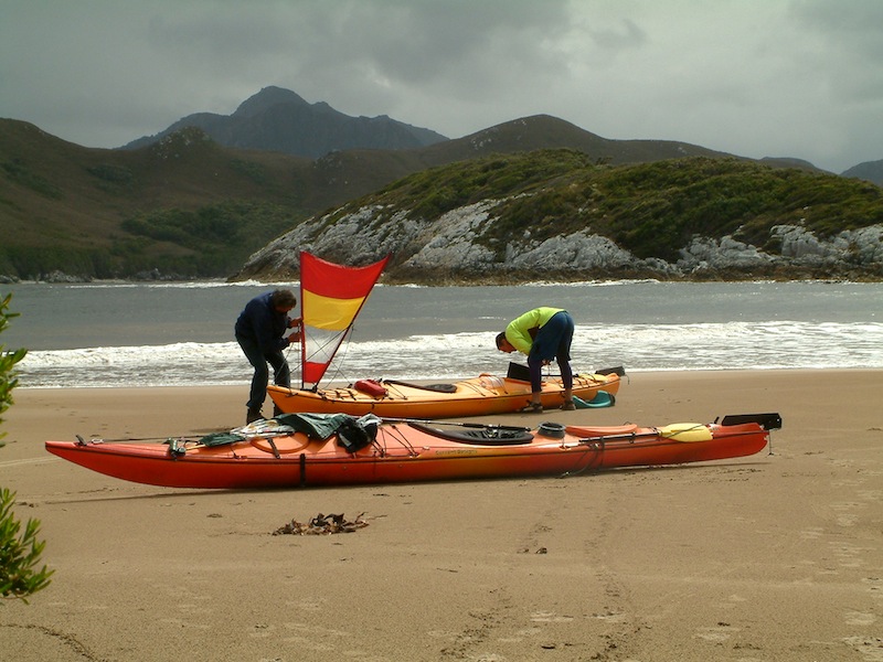 Preparing two of the three sea kayaks we took to the SW Wilderness. The highest mountain on the horizon is Mt Rugby.