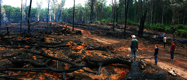 Clear felling and replanting to plantation forests is a complex business. After useable timber has been removed all flora that might hinder the growth of plantation trees are burnt using napalm dropped from helicopters and animals that might take a fancy to young plantation seedlings are shot. Up until recently 1080 poison laced carrots were distributed to eradicate the area of wildlife.