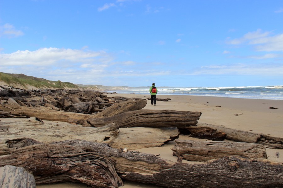 Bev wandering along a driftwood strewn beach at the Edge of the World.