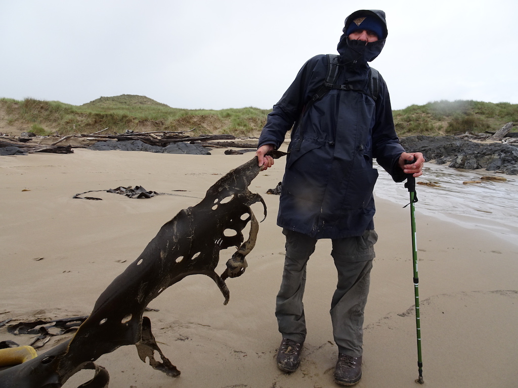 Getting a piece of bull kelp with the idea of making a stock of kelp energy bars.