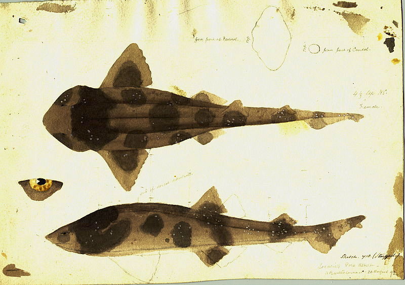 An 1892 illustration by Arthur Bartholomew of a draughtboard shark (Cephaloscyllium laticeps). Image credit: From Wikipedia.