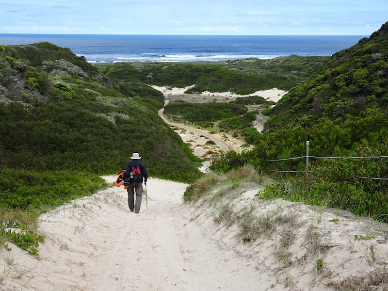 Walking over the sandhills to a beach north of the Arthur River mouth.