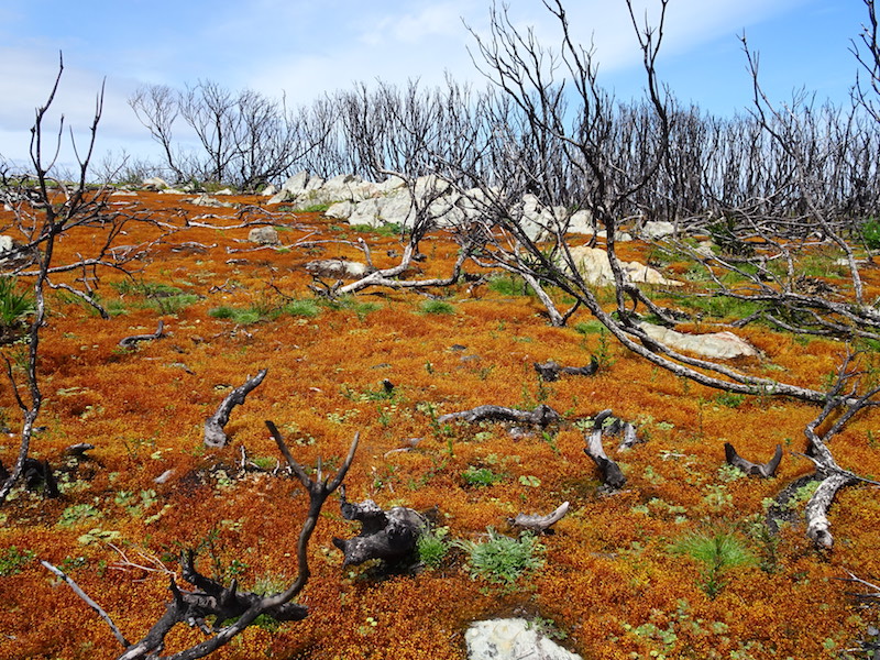 Volunteer plants (species unknown) regenerating a fire ravaged site.