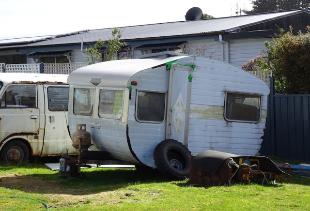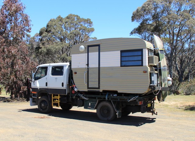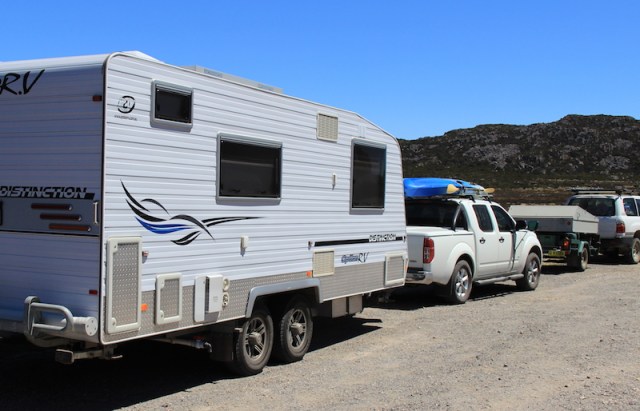 The big rig in the above photograph would most probably be self-contained with shower, toilet and laundry. Our humble double bed size rig is parked in front of the big one.